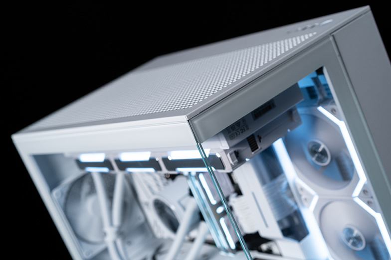 顶部也是大面的开孔设计,底部进风,顶部出风,形成良好的风道。两个玻璃侧板的边缘都经过倒角处理,拼接处十分规整。