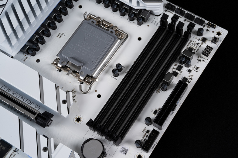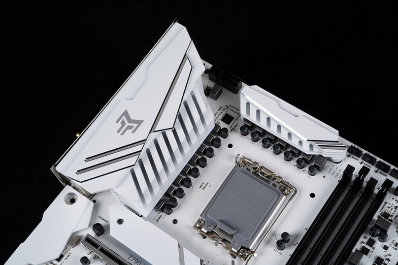 Z790 金属大师 D5 WI-FI 白金版为标准ATX板型,最显著的特征是采用了白色的PCB,主板大面积覆盖白色METALTOP铠甲,包括VRM、SSD散热片、南桥散热片、搭配银色的斜切金属线条,设计风格独特,相当符合“金属大师”的气质。