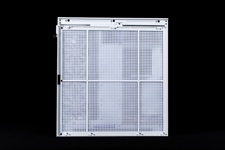 箱体的另一侧的盖板采用全镂空设计,同时内部配有同等面积全覆盖的可拆卸磁吸防尘网,在保证散热效能的基础上确保内部防尘。