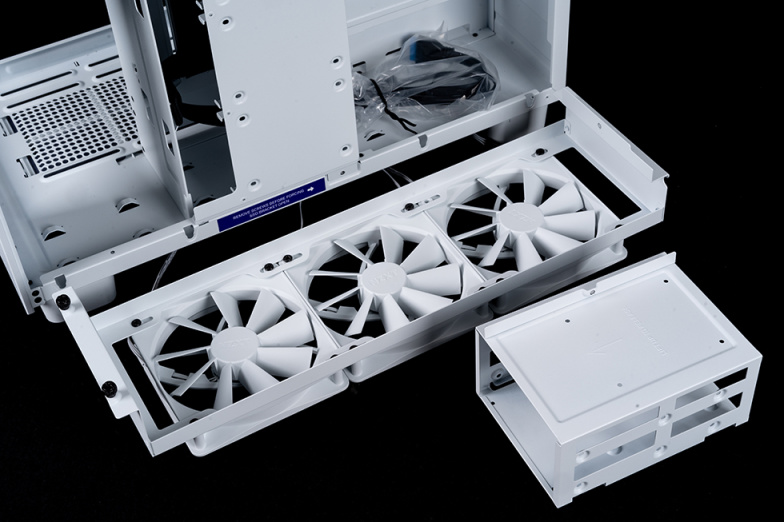 顶盖采用无螺丝的快拆设计,卸下顶盖后可以看到顶部的水冷和风扇安装位,支持最大360mm规格的液冷散热器,或三个12cm的散热风扇。