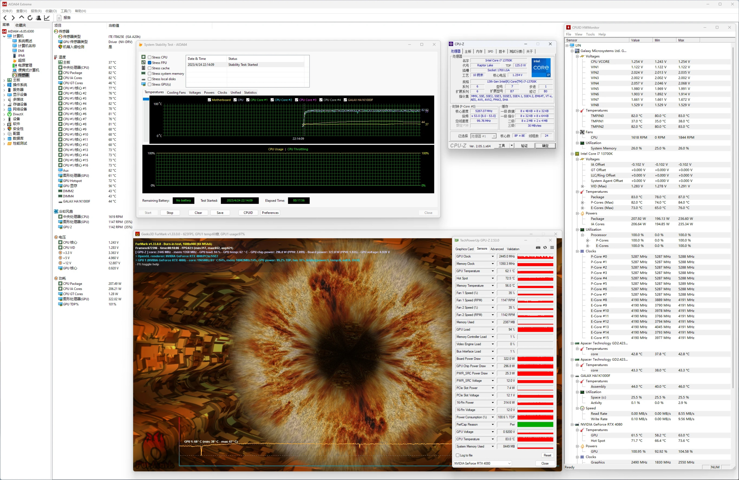 整机双烤测试,CPU最高 84℃,5.3G,最高功耗230W,显卡62.1℃,风扇1600rpm。