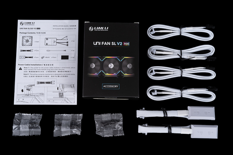 三联包的附件包含了控制器*1、风扇安装螺丝*12、电源与灯光线合一线*4、风扇并联连接线*2、说明书及快速指南。