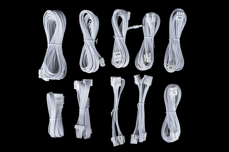 模组线线缆和接口均为白色,主板24pin、CPU8pin、显卡8pin供电接口线材采用白色编织包网,其余线材则为扁平化设计。CPU接口模组线长度为1m,可应对各种尺寸的大型机箱安装需求。