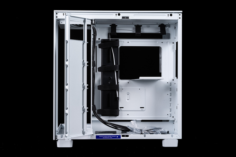 打开中间的2.5寸硬盘支架,可以看到内部独立的理线槽和固定魔术贴,得益于背部充足的空间,使得理线工作异常轻松。