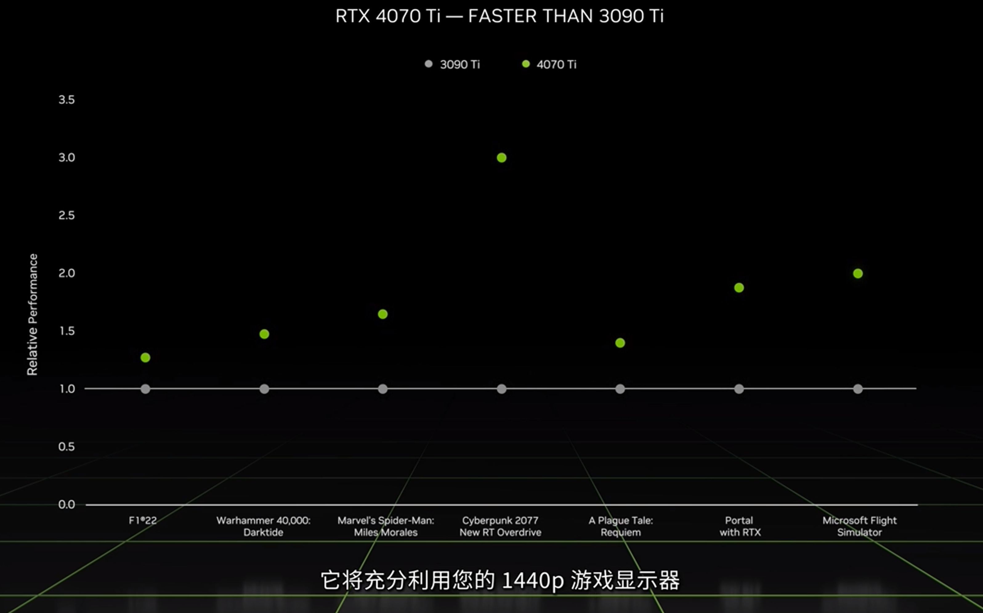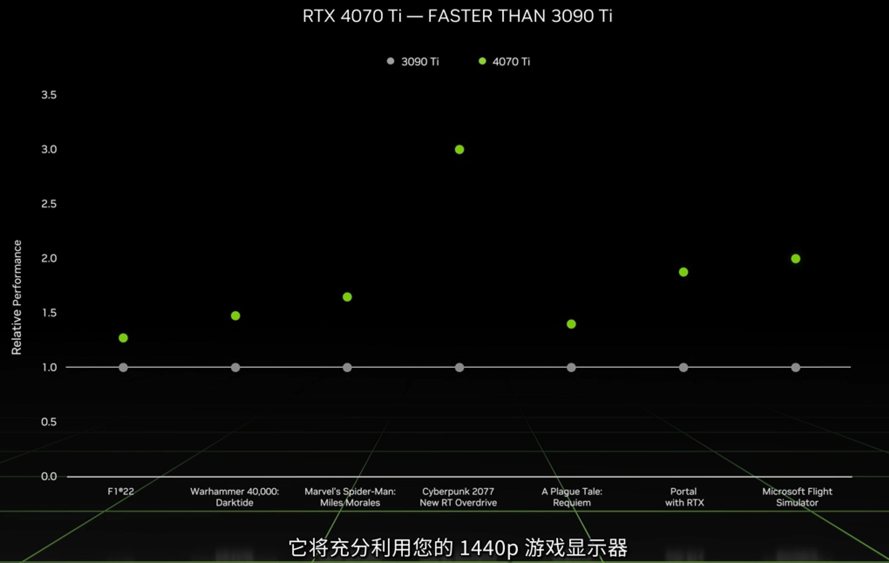 ▲英伟达官方对RTX 4070 Ti的定位为能在2K分辨率(1440P)下,提供超高帧数的游戏显卡,得益于带有插帧功能的DLSS3技术,英伟达宣称RTX 4070 Ti的游戏性能要比上一代安培架构的卡皇RTX 3090 Ti表现还要好,因此我们今天的测评将会集中在2K分辨率。