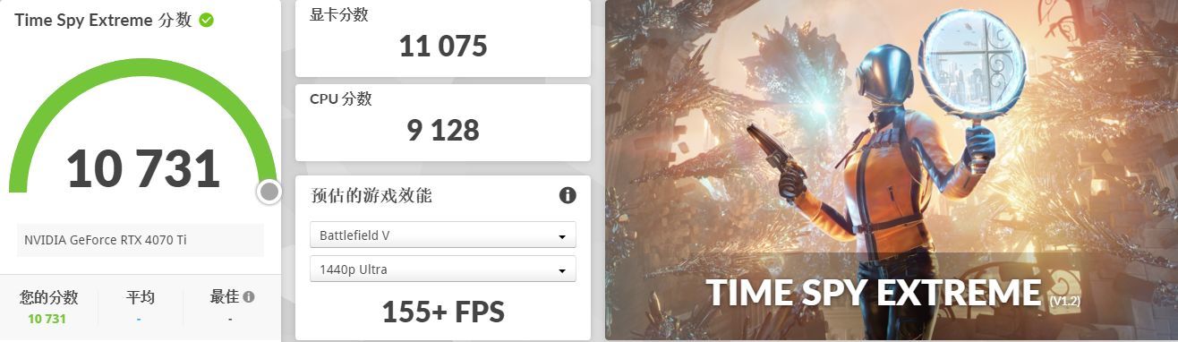▲RTX 4070 Ti的Time Spy Extreme显卡得分为11075分,基本与RTX 3090 Ti持平。