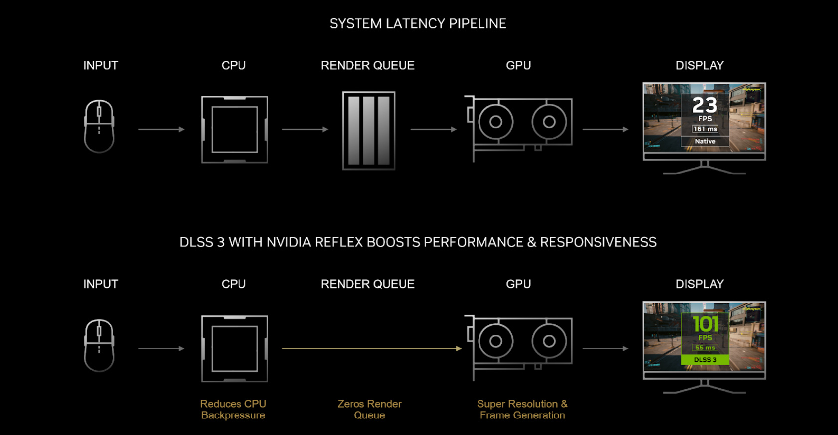 ▲而通过将NVIDIA REFLEX SDK直接集成到游戏中,就可以使CPU的帧处理速度与GPU的渲染速度保持同步,大幅降低渲染队列,并降低CPU背压,进而使游戏能够采样键鼠等外设最新的输入。最终降低画面与输入延迟,提高游戏体验。目前,NVIDIA REFLEX技术已经被集成在了DLSS 3中。