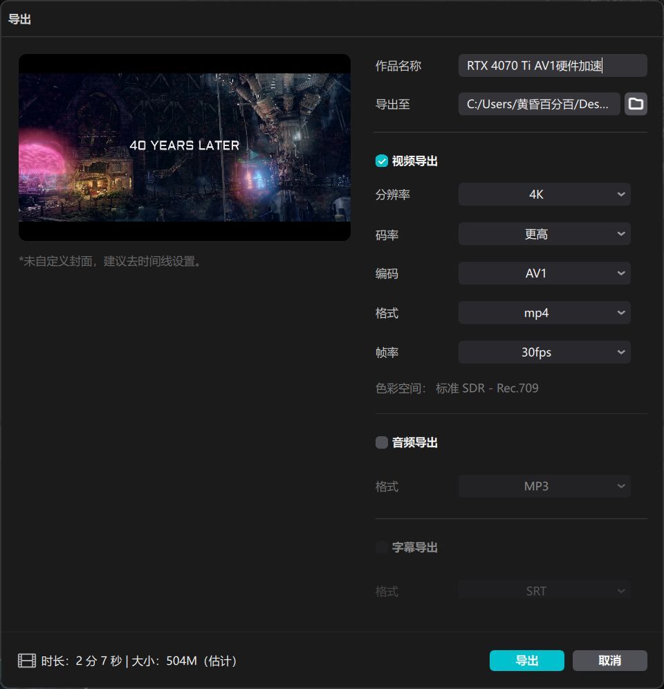 ▲视频导出参数为4K 30FPS,更高码率,分别以AV1编码与H265编码进行导出。