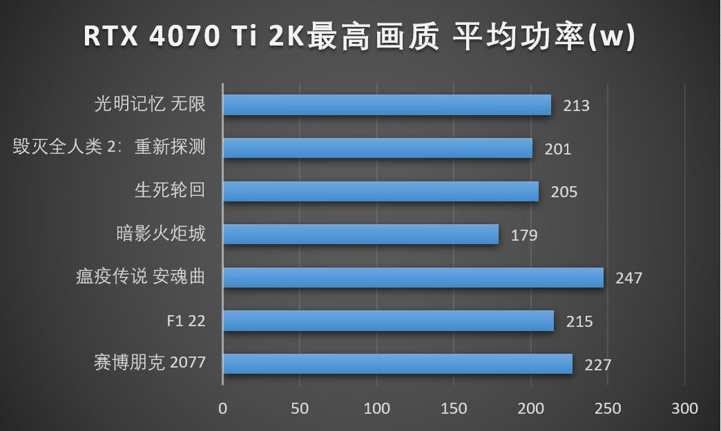 TGP是GPU运行时的能耗上限,在运行诸如大型游戏等高功耗应用是,GPU功耗可能会达到TGP,而RTX 4070 Ti的TGB为285W,在刚才我所进行的测试中,NVIDIA游戏性能监测软件FrameView所记录下的平均功耗最高为247w,最低为179w,可见在2K最高画质下进行游戏时,RTX 4070 Ti的供电与散热仍有很大冗余空间,足以应对更严苛的任务,这些都是得益于NVIDIA全新的ADA架构以及TSMC 4N所带来的每瓦性能提升。