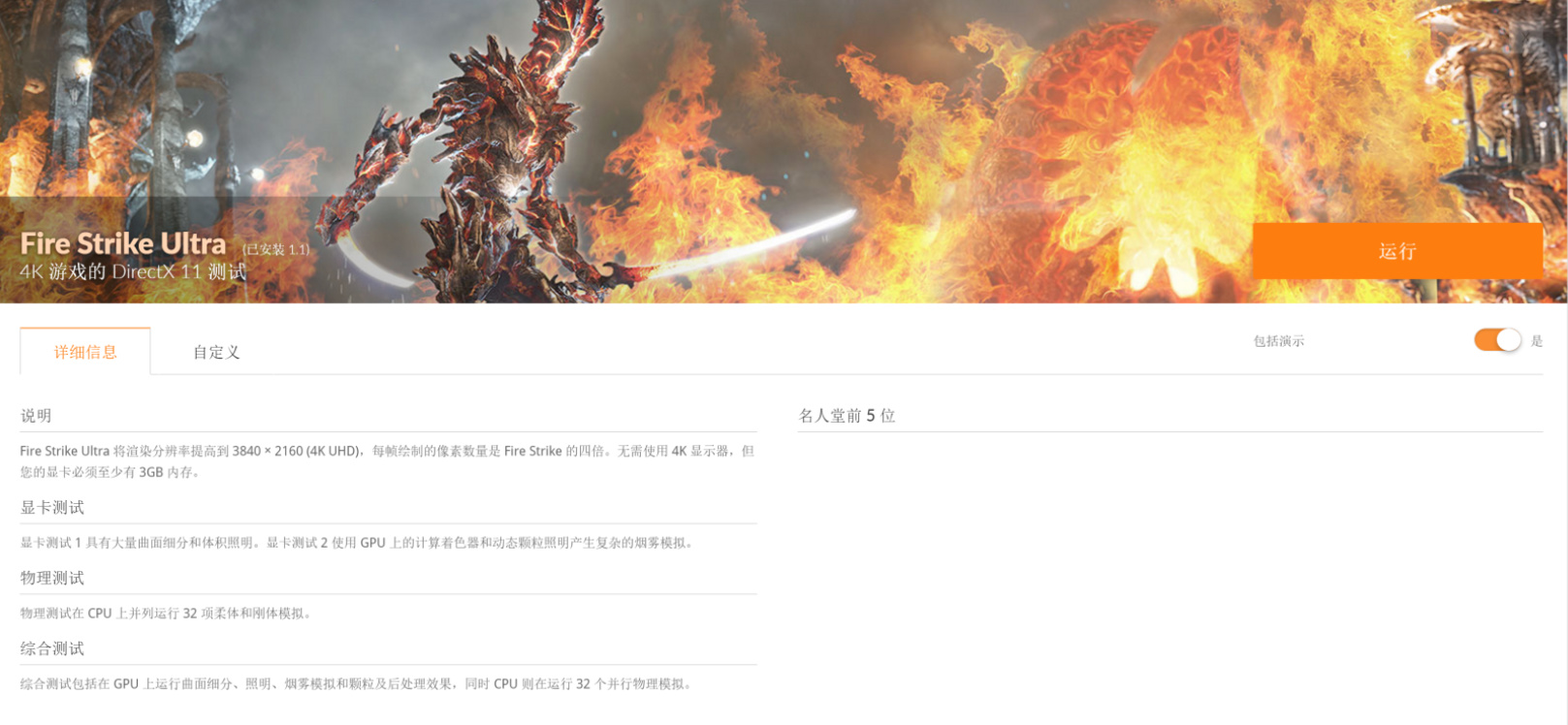 ▲Fire Strike 是一项适用于高性能游戏电脑和超频系统的 DirectX 11 基准测试。即使对于最新的显卡而言,Fire Strike 测试也非常严苛。而Fire Strike Ultra是其4K版本。