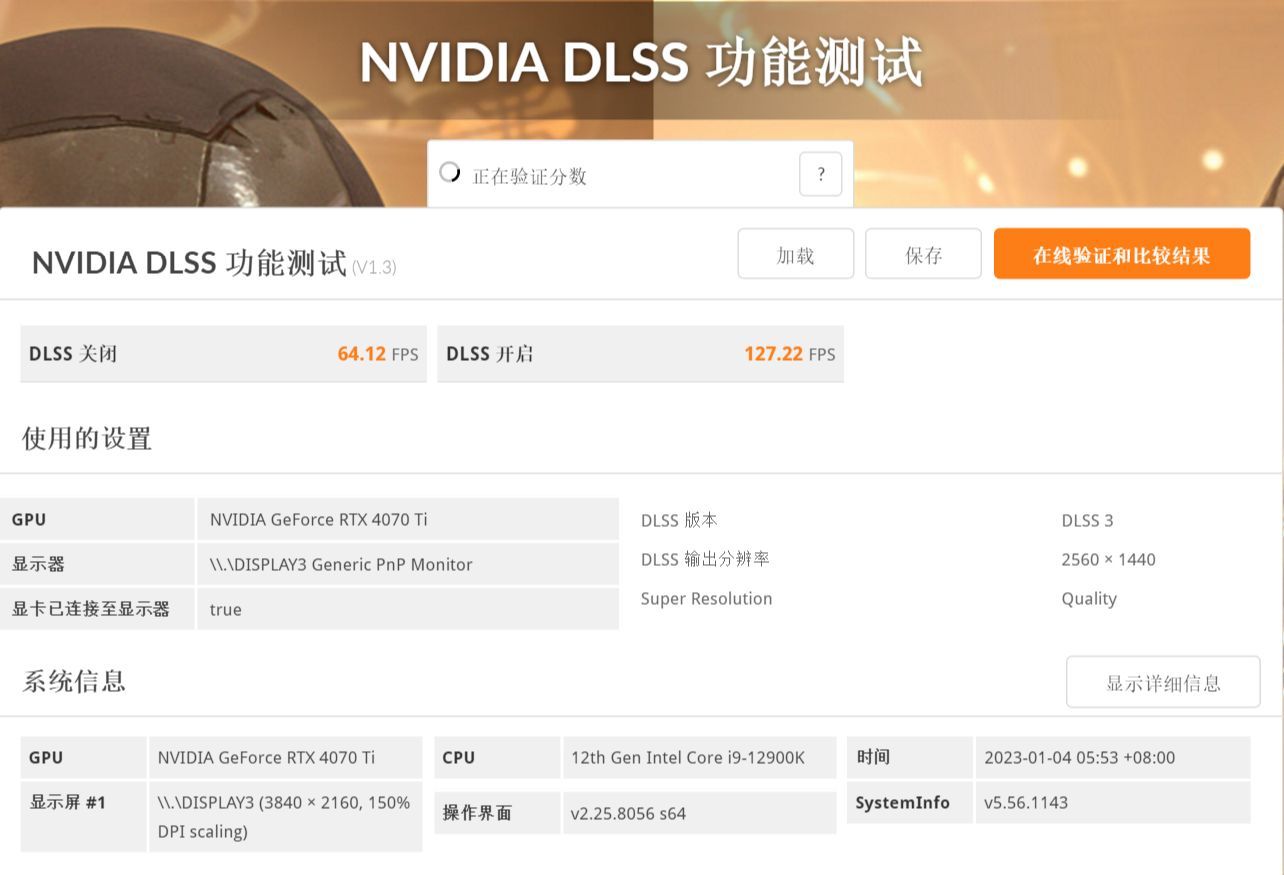 ▲3D Mark DLSS test是专门测试显卡DLSS性能的基准测试,其测试原理为连续进行两次的3D Mark Port Royal 光线追踪 基准测试,第一次为关闭DLSS功能,第二次为开启DLSS功能,通过游戏帧数变化来测试DLSS功能对游戏性能的提升,目前3D Mark DLSS test 1.3版本已经支持DLSS 3的潜在帧生成技术。