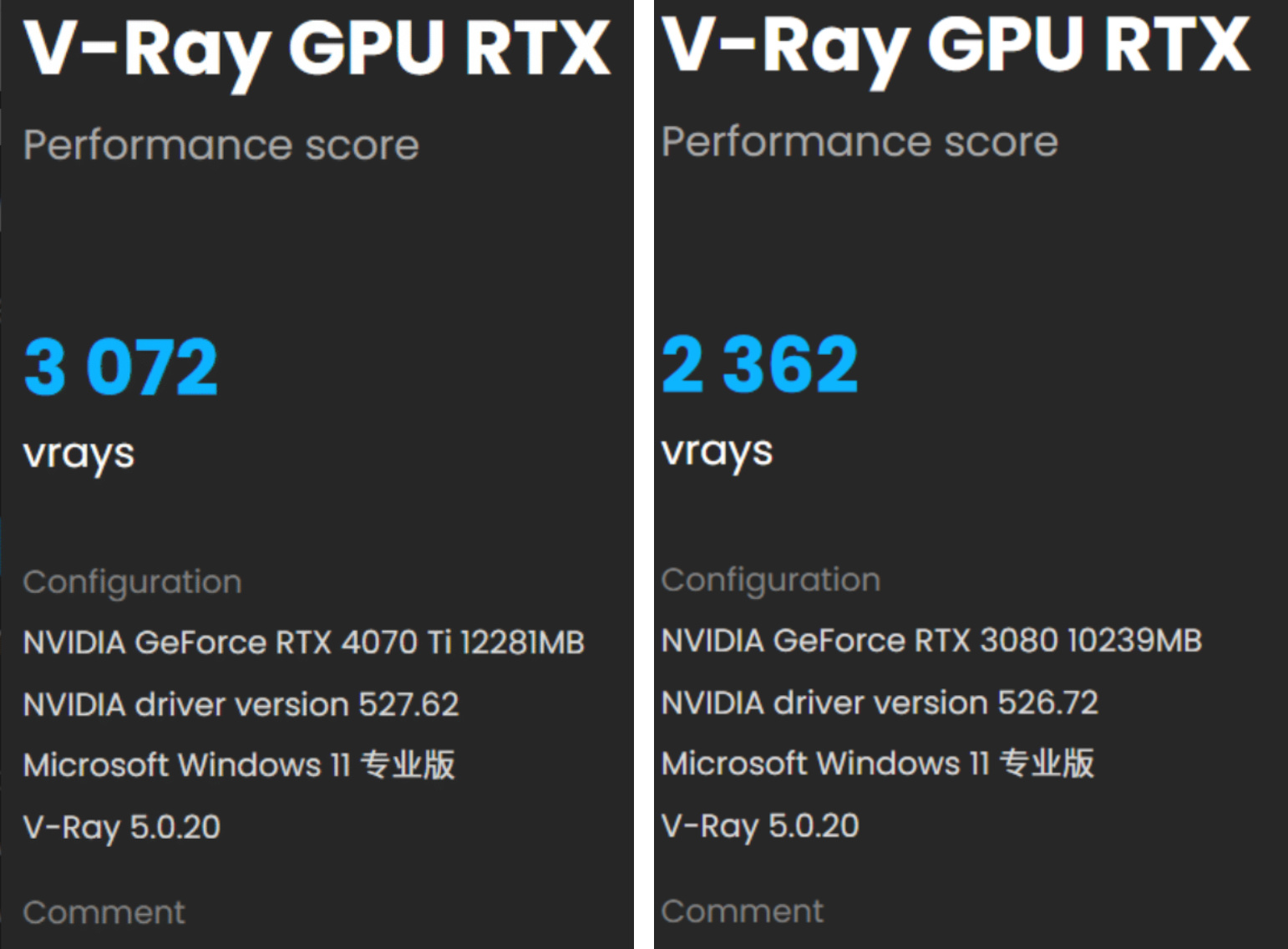 ▲RTX 3080 10GB的V-Ray GPU RTX得分为2362分,而iGame GeForce RTX 4070 Ti Vulcan OC的得分为3072分,是RTX 3080 10GB得分的1.3倍。