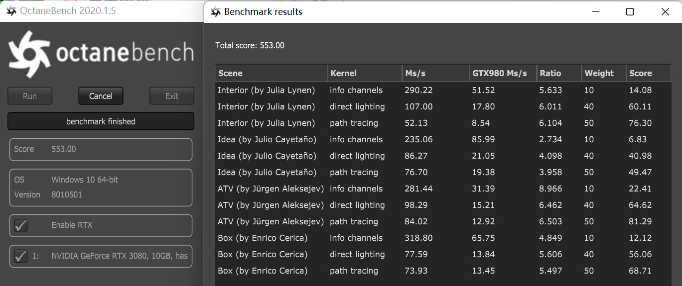 ▲RTX 3080 10GB的OctaneBench得分为553分。