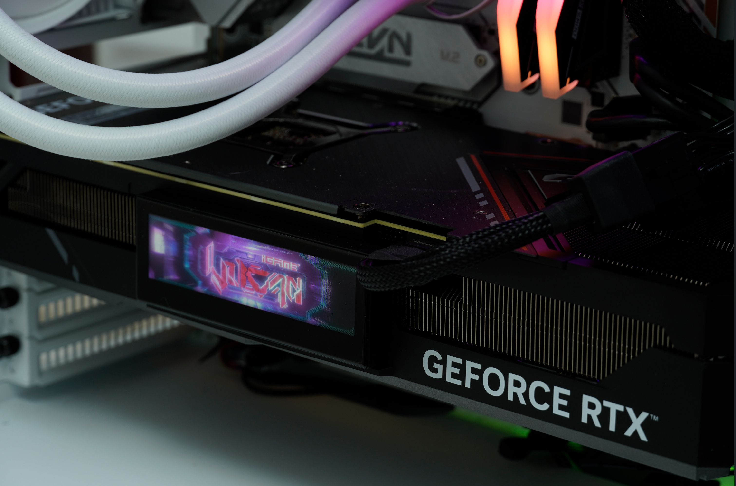 ▲而iGame 火神显卡最具识别度的LCD显示屏在本世代得到了巨大升级,不仅屏幕分辨率提升到了800*216px,画面更加清晰,而且采用磁吸式分体设计,无论显卡横装、竖装,屏幕内容总在你面前。