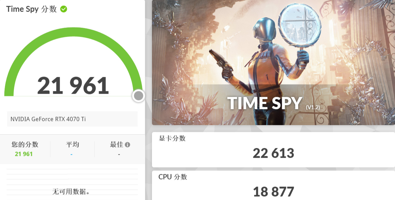 ▲在2K分辨率的3D Mark Time Spy中,RTX 4070 Ti的总分为21961分,显卡得分为22613分。