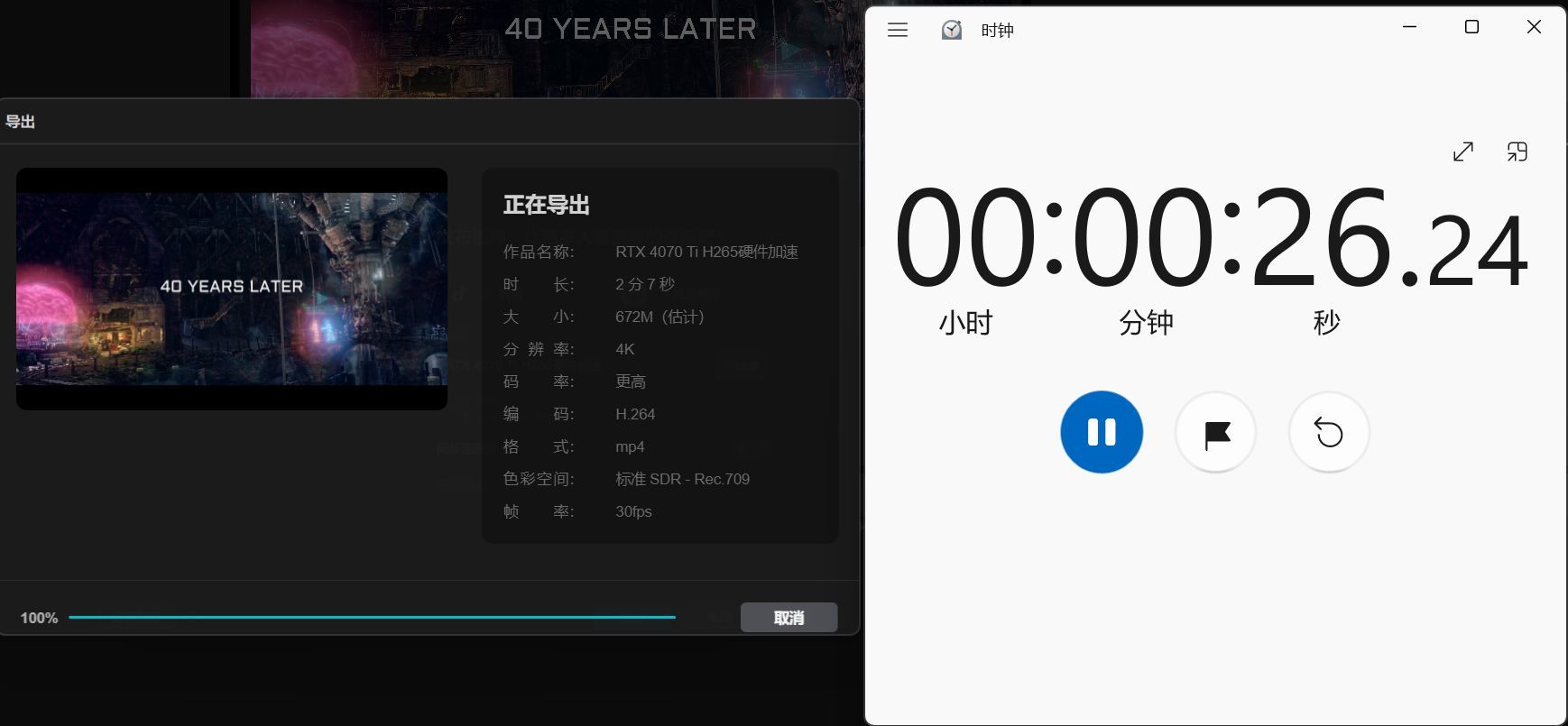 ▲而以同样的参数开启硬件加速,导出 4K H265格式的视频时,则同样用时约26秒,比开启硬件加速时导出AV1格式的视频慢了62.5%,可见视频的时长越长,通过硬件加速导出AV1格式的视频对时间的节约也越加明显。
