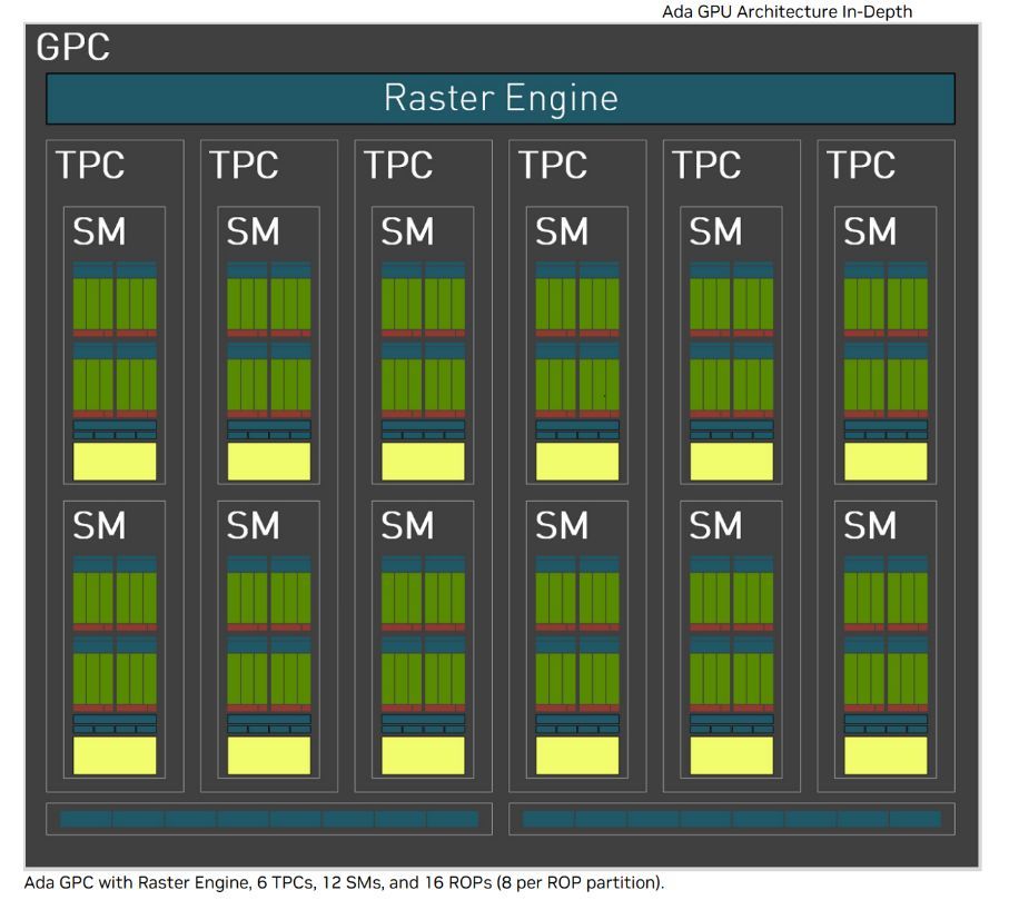 ▲而Ada架构的GPU则是由多个GPC组成的,RTX 4070 Ti所搭载的AD 104芯片为例,其拥有5个GPC,30个TPC,60个SM,7680个 CUDA核心,并搭载了12GB 的192bit的GDDR6X显存。