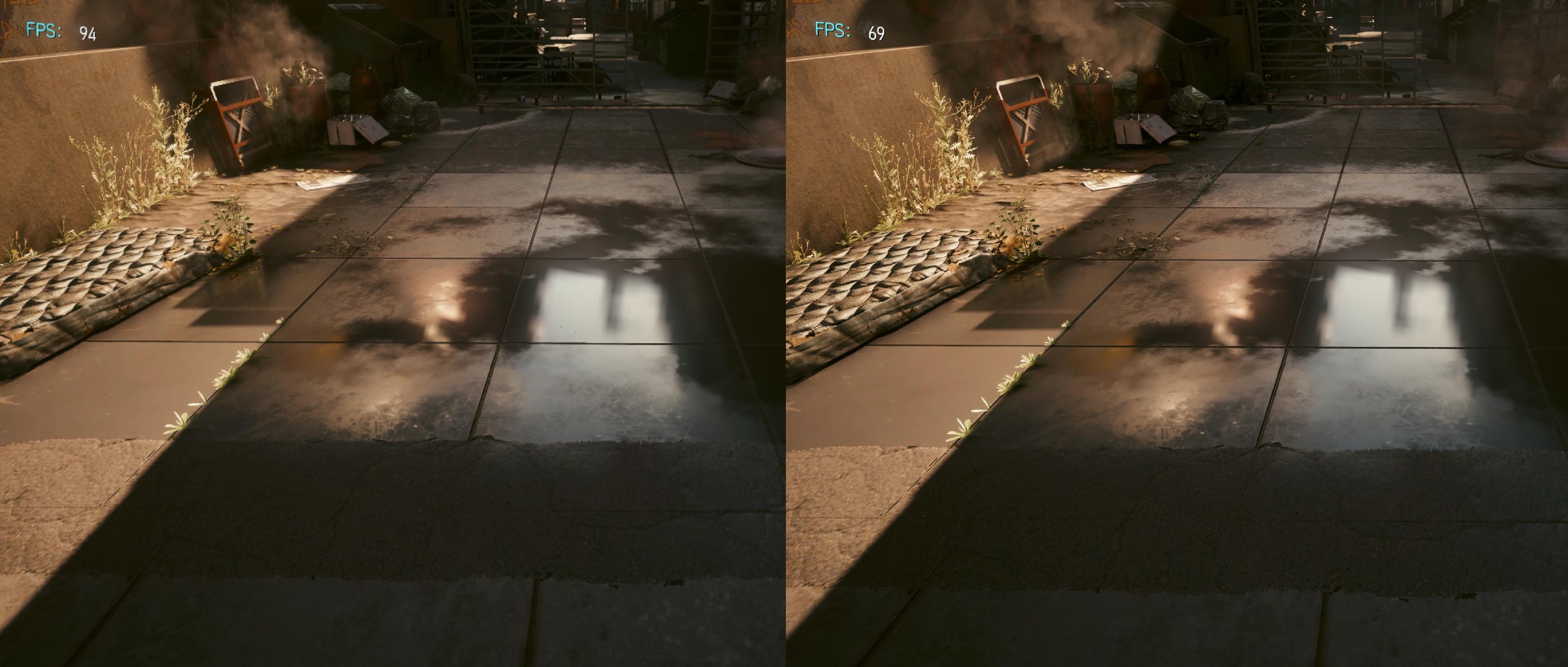 我们来比较一下DLSS开启后对画面效果的影响,左侧为DLSS性能模式下的4K分辨率,右侧为原生4K画质:
