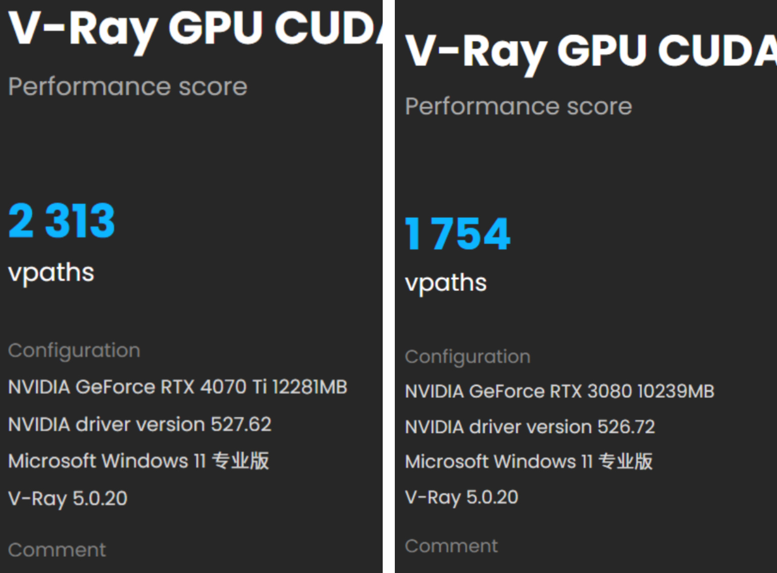 ▲RTX 3080 10GB的V-Ray GPU CUDA得分为1754分,而iGame GeForce RTX 4070 Ti Vulcan OC的得分为2313分,是RTX 3080 10GB得分的1.32倍。
