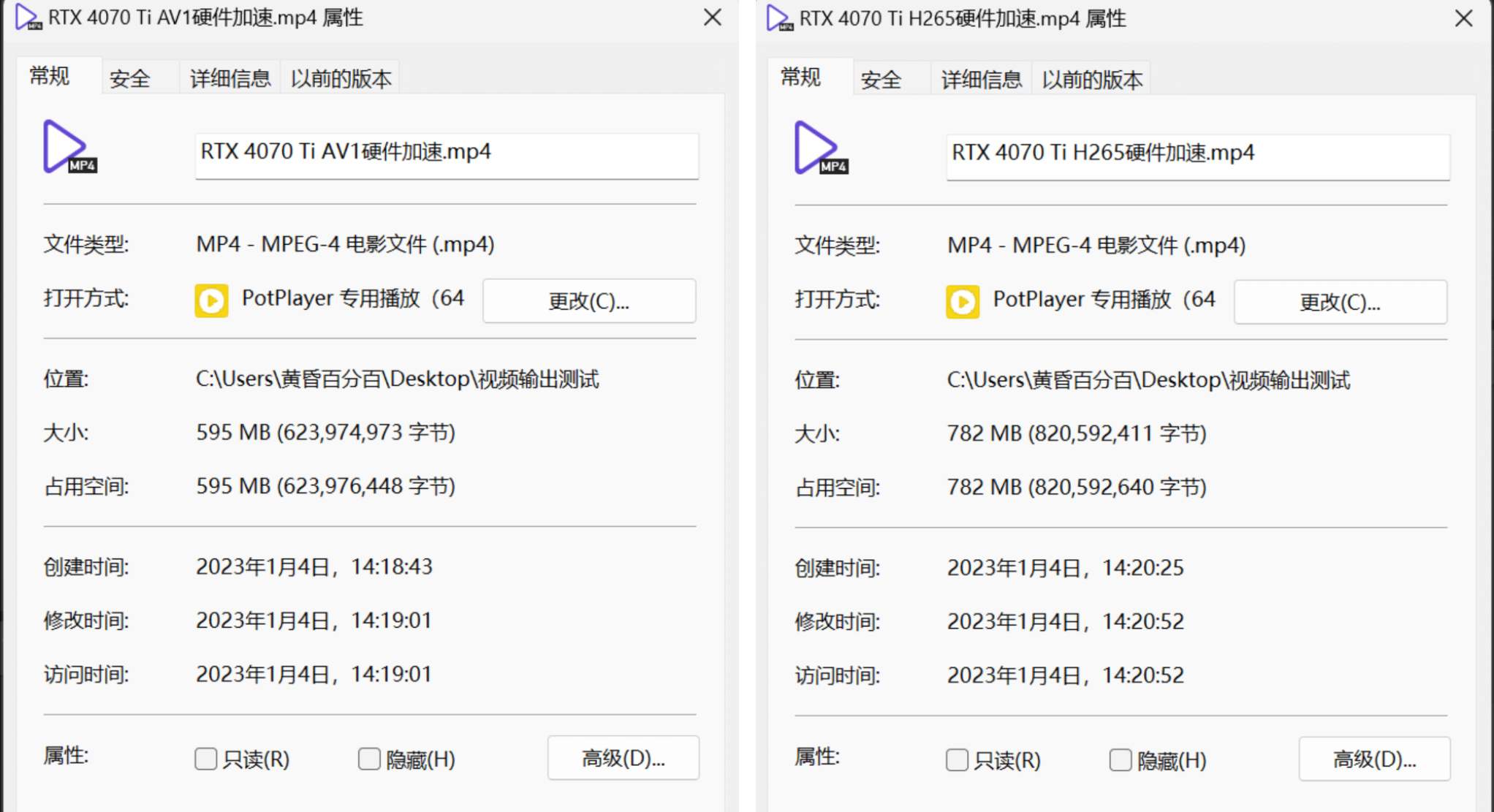 ▲这时我们再来比较体积,AV1编码的视频仅占595MB,相较于782MB的H265编码视频,瘦身了约31.4%。
