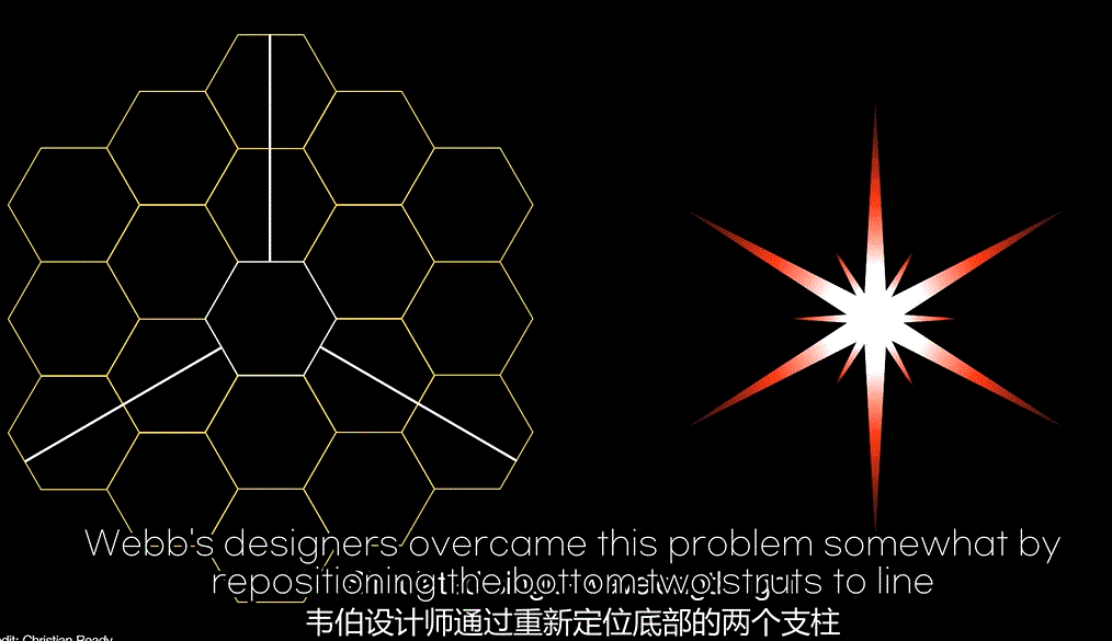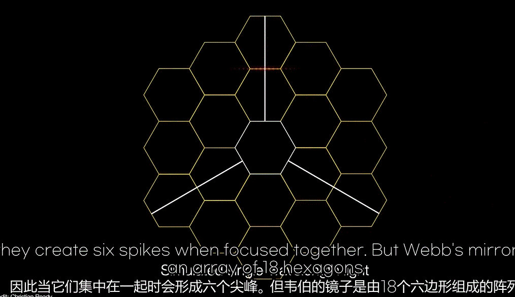 由於韋伯的輔助支柱只有三個支撐支柱,因此當它們集中在一起時會形成六個尖峯。但韋伯的鏡子是由18個六邊形組成的陣列,每個六邊形都有六個平邊。因此,每個部分都會產生自己的六個衍射尖峯,並且它們都會在交點處匯聚在一起。請注意在此圖中,主鏡支撐結構的六個原始尖峯仍然可見,因爲支柱互成120度。韋伯設計師通過重新定位底部的兩個支柱,使其與底部六邊形的平邊平行,從而在一定程度上客服了這個問題。使得四個尖與衍射圖案的其餘部分重疊,