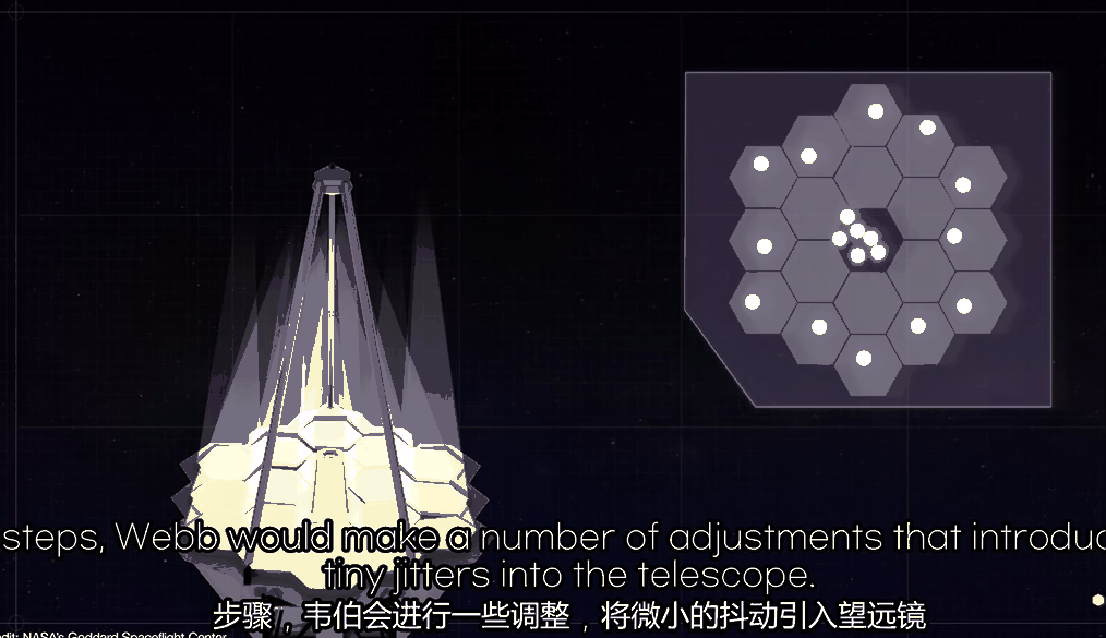 下一步是使陣列中的每個圖像儘可能清晰.而這是通過將次鏡向後移動約400微米來使望遠鏡失焦來實現的,通過相位檢索分析圖像,以計算出這些鏡子的不對齊程度,然後調整這些鏡子並使第二個鏡子重新聚焦。現在有18個清晰的圖像,下一步是將它們堆疊在中心。這似乎很容易,但實際上是一個非常棘手的過程,因爲圖像需要堆疊到光波長度的一小部分,否則,無法進行單個鏡子所需的精細對齊。因此,韋伯的圖像被堆疊成一組,每組六個部分,在初始堆疊結束時,圖像看起來更像一顆星星,然而,這些部分仍像18個獨立的望遠鏡一樣工作,因爲它們還沒有很好地對齊。爲了使該部分充當單個鏡子,它們需要在小於光波長度範圍內對齊。現在,這是一個稱爲分段對齊的過程,對齊在粗相位和精細相位兩個主要步驟中完成。在粗相位期間,目標是減少分段之間的所謂 ” 活塞誤差 “。爲了測量活塞誤