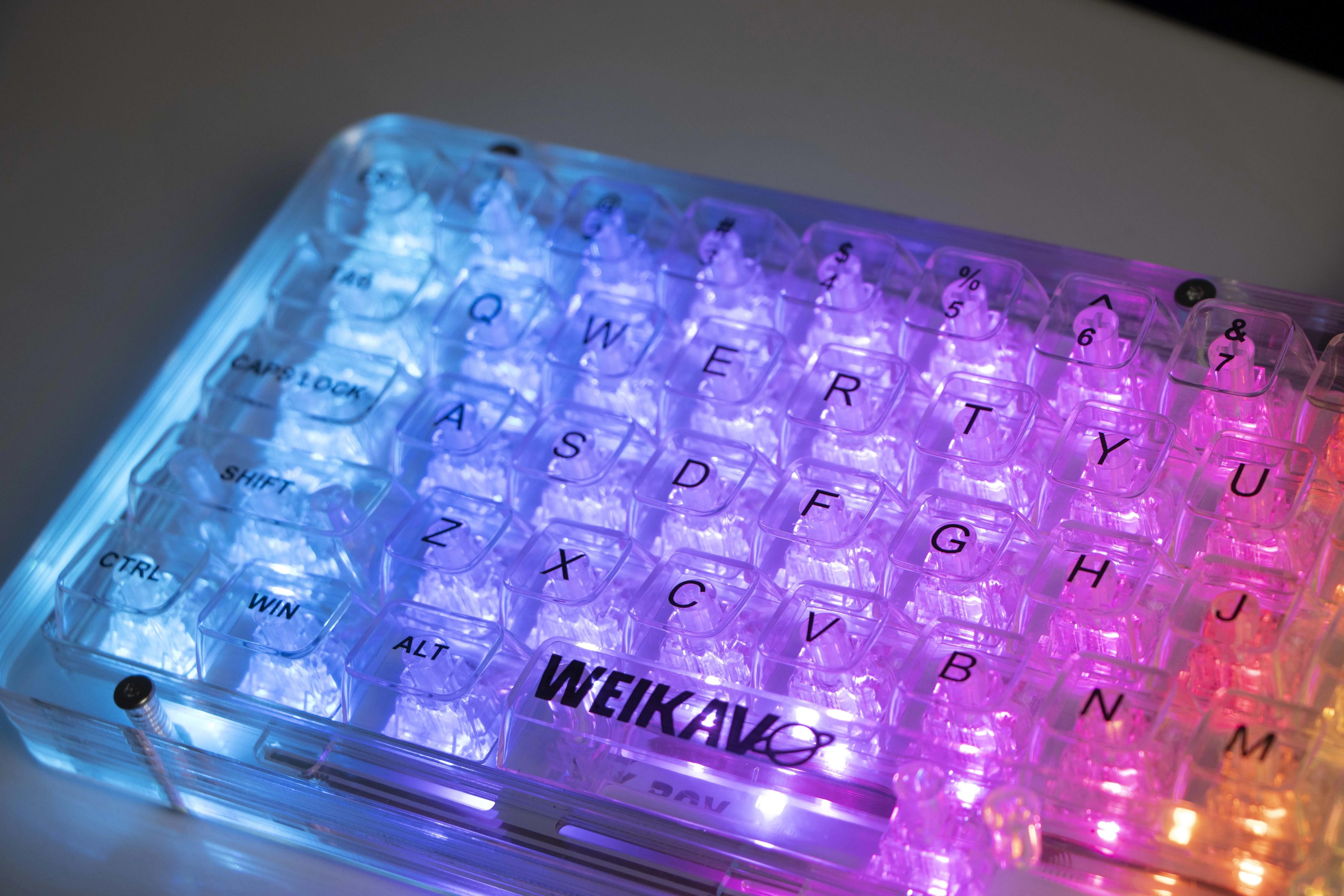 ②RGB玩家,虽然常规键盘现在都带RGB(彩色灯光瞎几把乱闪)不过有些对于自己眼睛不怎么爱护的朋友还是不满足,那么就会买一些透明键盘,这些键盘往往会有很高的溢价,并且因为光滑的表面材质而及其容易刮花。
