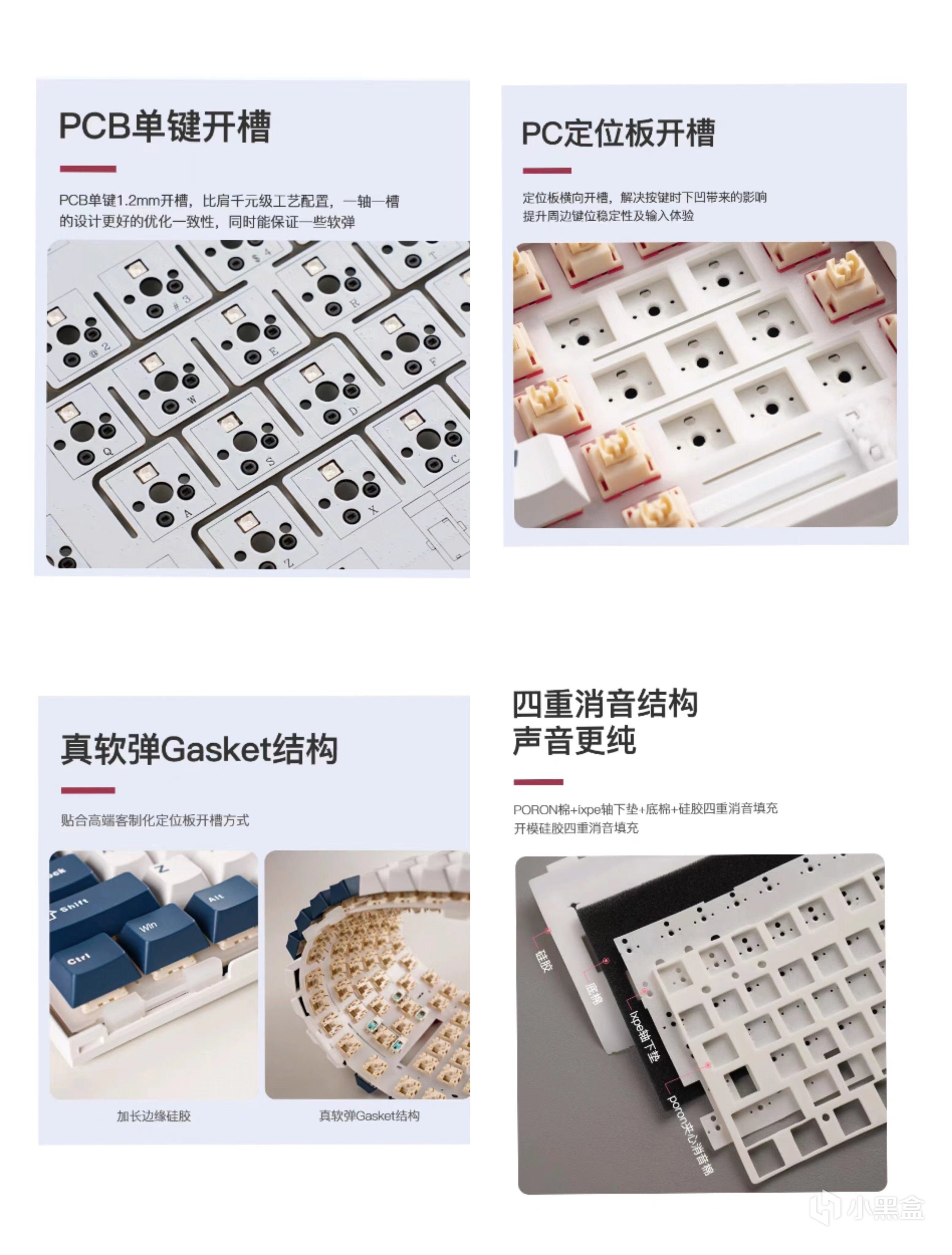 PCB单键开槽、定位板开槽,加长边缘的定位板硅胶套,三剑合璧组成了目前量产最软弹的真GasKet结构,真的是肉眼可见的形变,299就能让大多数消费者体会到客制化动辄千元的单键开槽,这点真的可以说是RK对量产键盘的颠覆,是键圈玩家的福音。