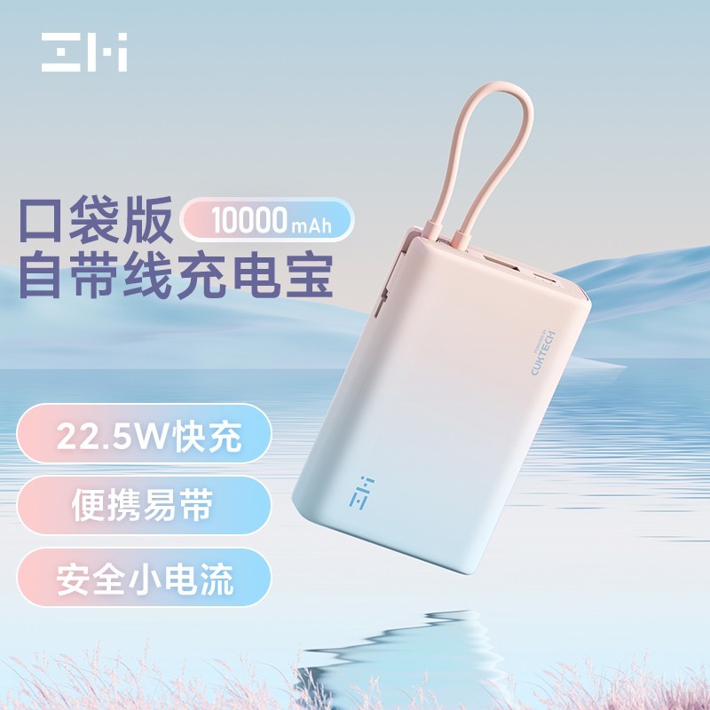 小米旗下 ZMI|CUKTECH 發佈了全新的自帶線充 10000mAh 充電寶口袋版,自帶雙向 Type-C,一根線支持充電 + 放電,支持 22.5W 快充,可適配小電流設備,採用粉藍漸變色,售價 149 元,券後價 139 元。