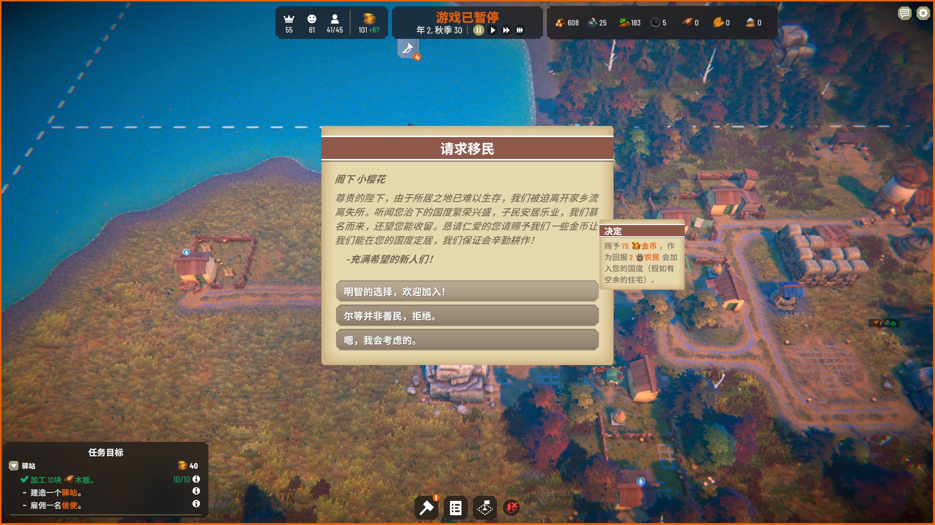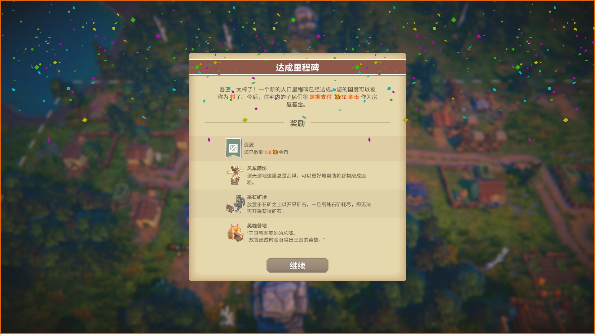 當居民數量達到閾值後,玩家便會收到賀禮,並且解鎖全新的建築、設施等。