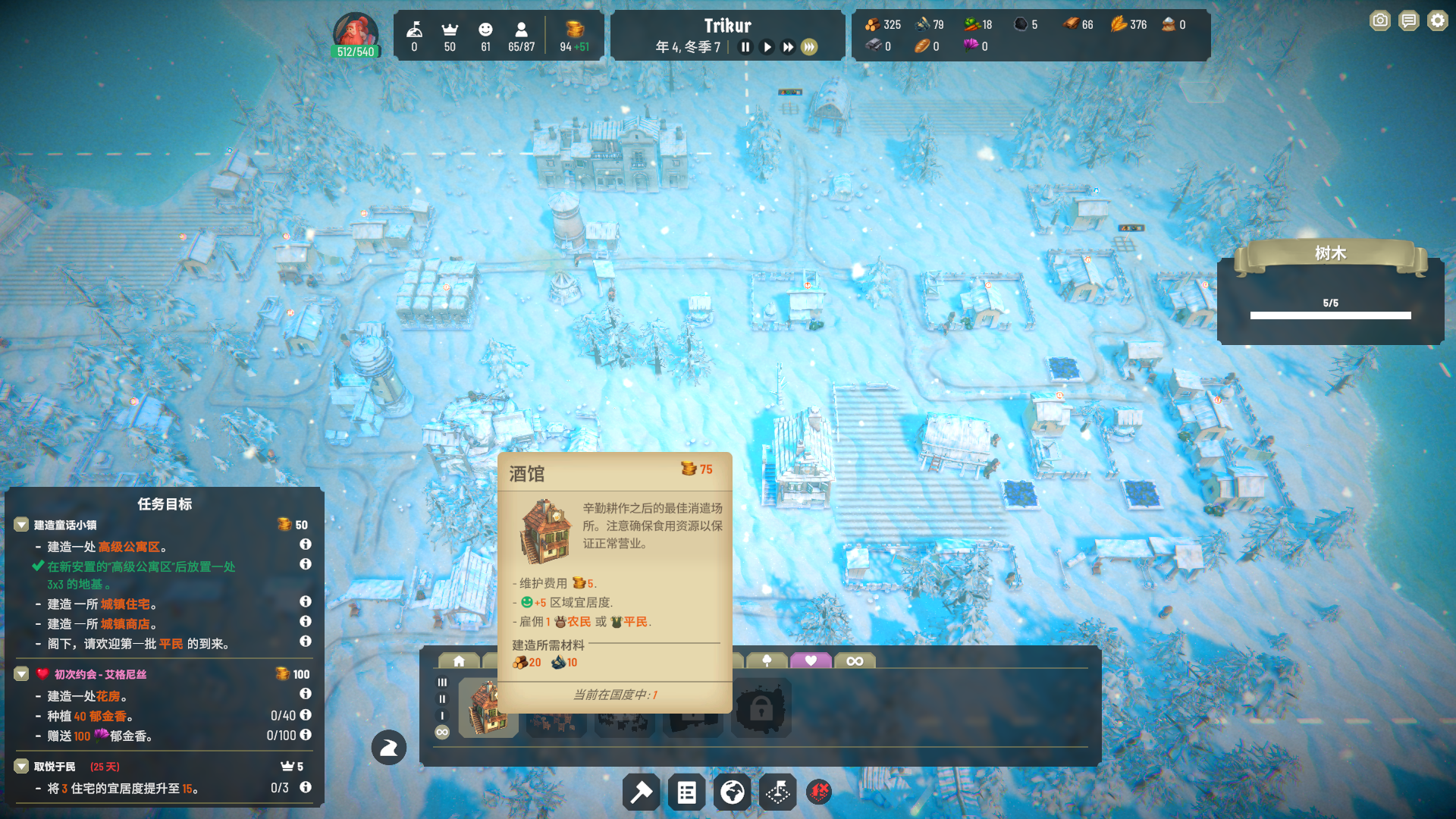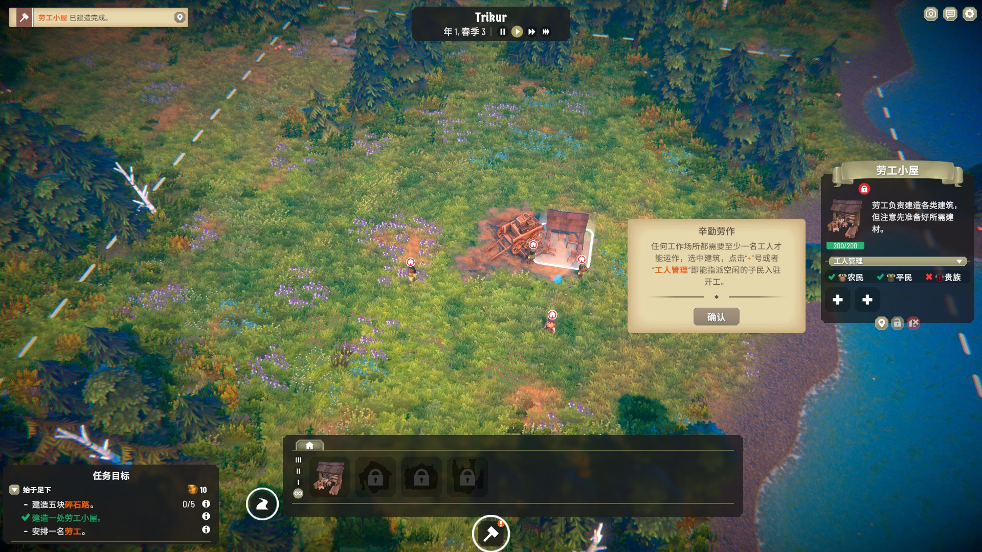 開局,有現成的資源可供採集。所有的工作場所,都需要手動派駐工人才能正常運營。