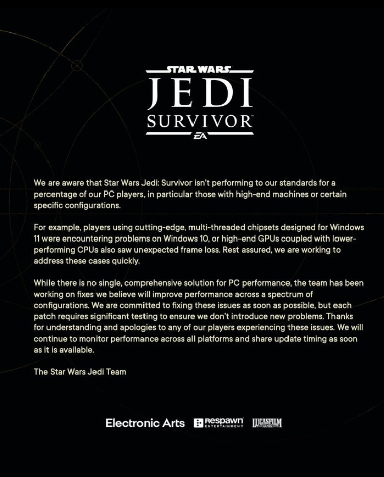 近日,EA就《星球大战 绝地:幸存者》PC版优化发文致歉。