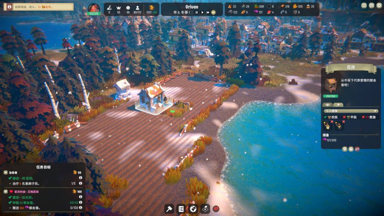 游戏开局给了一段可跳过的小剧情,之后就是选择地图和模式,地图是完全随机种子可以反复刷新刷到你想要的国家,资源自然多多益善。模式分两种,一种是普通的生存模式,一种是无限资源无限建造的创造模式;前者主要是体验种田的过程难度也不大,任务也是可跟可不跟,选择权在于你;创造模式自由度更高毕竟资源无限,可以尽情创造出属于自己的国度~