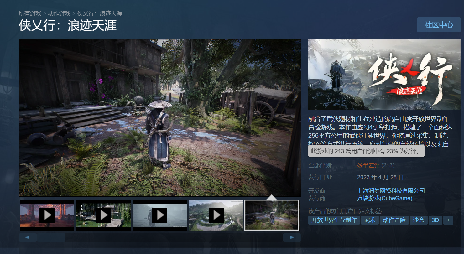 国产武侠游戏《侠乂行:浪迹天涯》融合了武侠题材和生存建造的高自由度开放世界动作冒险游戏,搭建了一个面积达256平方公里的武侠江湖世界。《侠乂行:浪迹天涯》已于4月28日在Steam平台发售,累计收到211条玩家评论,好评率低至“22%”。
