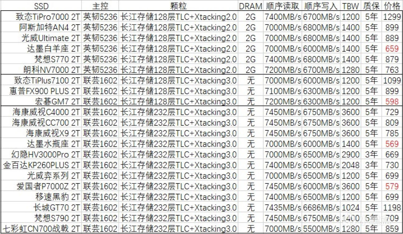 然後接下來就是遊戲盤的選擇,說實話,這下來到了主戰場,各種二三線品牌都可以選擇,對此處我沒什麼好說的,我的評價是各憑本事,各顯神通,看看誰能狠狠薅羊毛嘍。(筆者已經買了2T愛國者P7000Z了),那種5XX就能到2T的可以買,但別存重要文件,放些遊戲可以。我的建議是直接2T版的上車吧,1T都有點浪費M.2接口了。