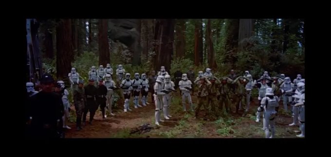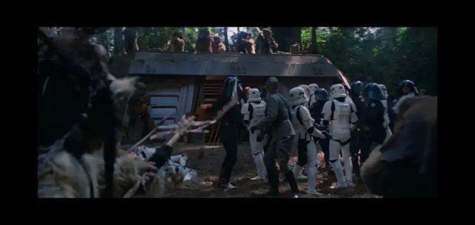 與此同時,恩多上的義軍被帝國軍隊包圍,但伊沃克人出手相助,在索羅的帶領下義軍地面部隊竟神奇的完成了反包圍