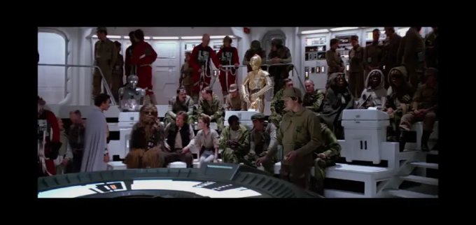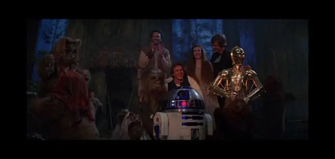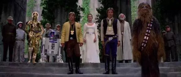 盧克和索羅被授予勳章,但奇怪的是站在最右邊的楚巴卡並沒有獲得勳章,原來我楚巴卡是個工具人