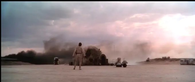 帝國的追兵沒有找到盧克和機器人,於是他們殺害了盧克的叔叔一家。盧克趕來時自己的家已經成爲了一片廢墟。此後盧克決定追隨歐比旺,加入義軍對抗帝國