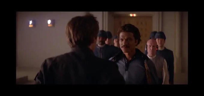 這時的蘭多已經成爲了星球的領導者,他臣服於帝國,他非常擔心自己的人民會因爲包庇索羅一行人慘遭滅頂之災,於是他選擇聯合帝國將索羅和公主囚禁交給達斯維達
