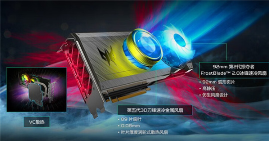 宏碁Arc A770 Predator BiFros 16GB採用了定製的散熱技術,雙風扇一個渦輪式、一個開放式,極爲罕見,其中第五代3D刀鋒速冷金屬風扇有89片0.08毫米超薄扇葉,第二代冰鋒速冷風扇使用92mm扇葉,搭配來福軸承,並集成8顆ARGB LED高亮燈珠,內部還有VC真空腔均熱板。