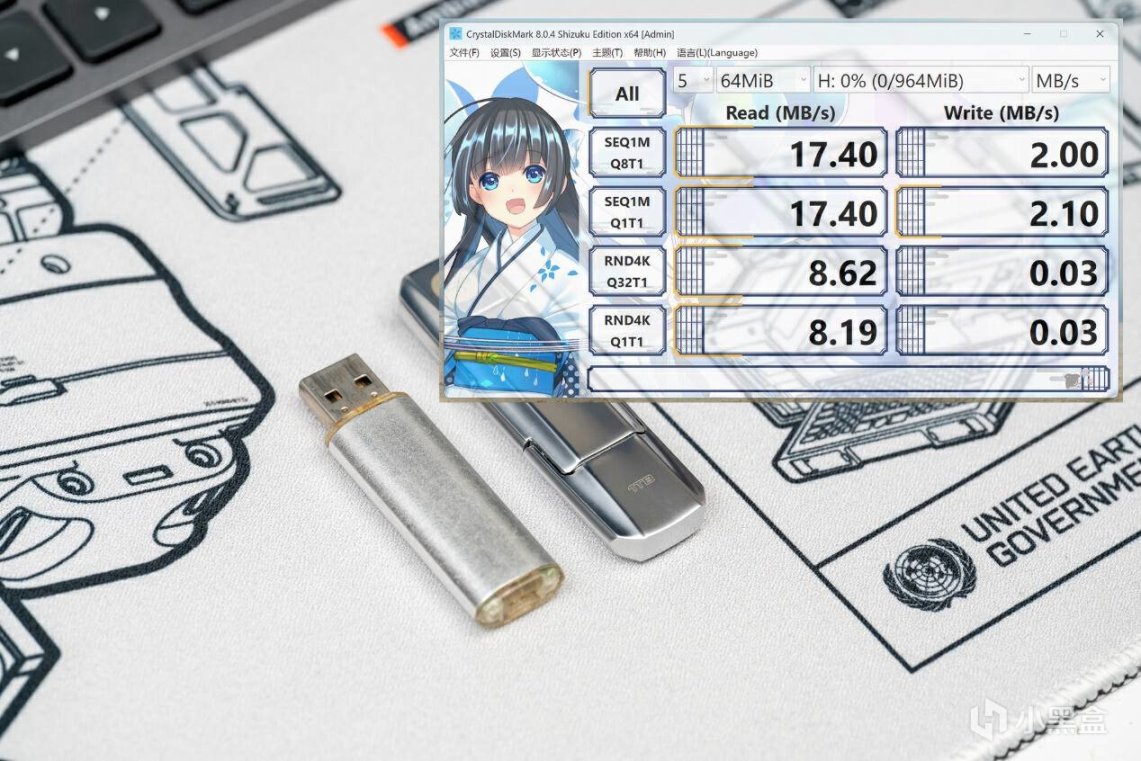 上图是我那只老古董U盘的读写速度测试,它的顺序读写速度只有17MB/s和2MB/s,4K随机读写速度更是惨不忍睹,按这种表现来看它最多也只有USB2.0的规格。