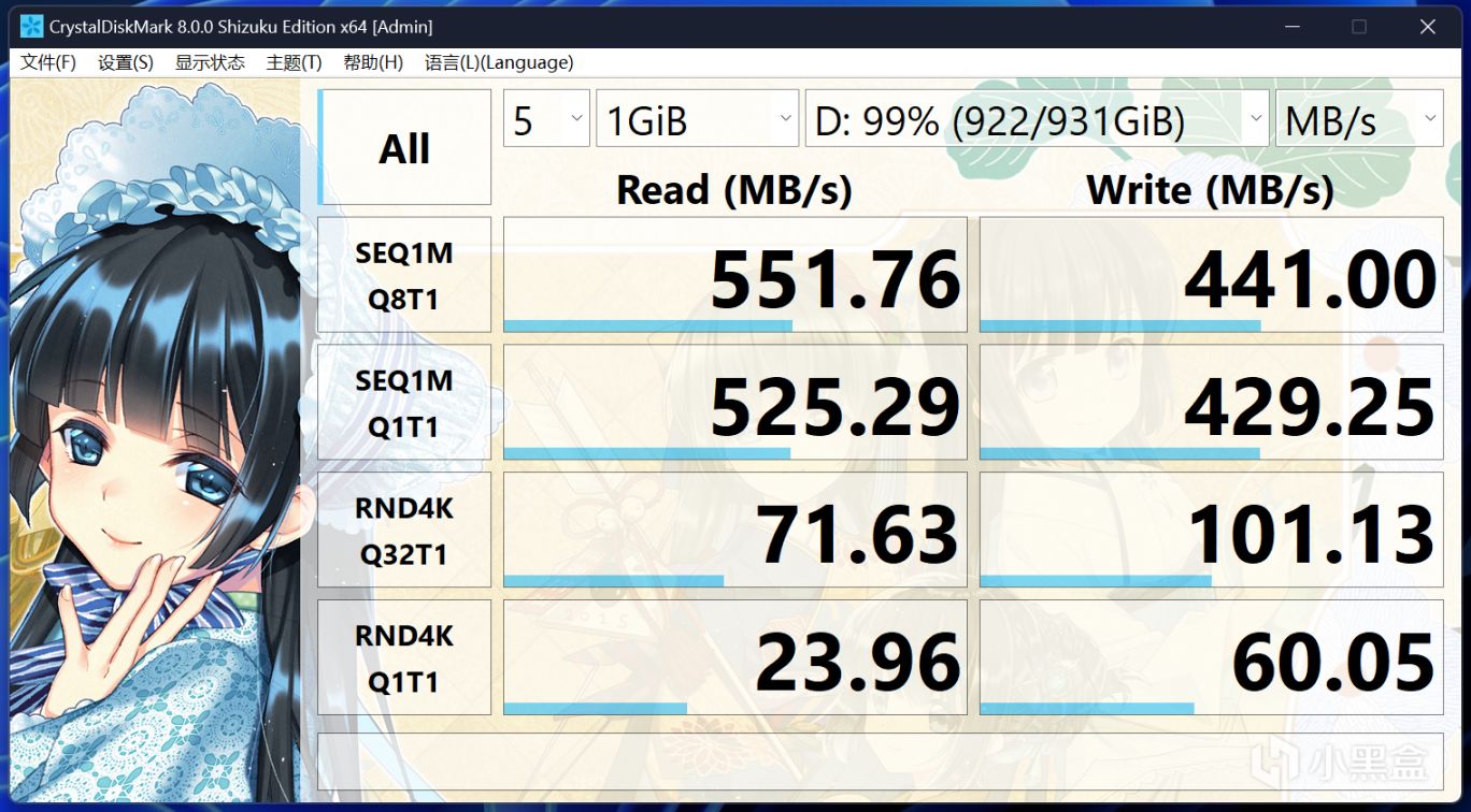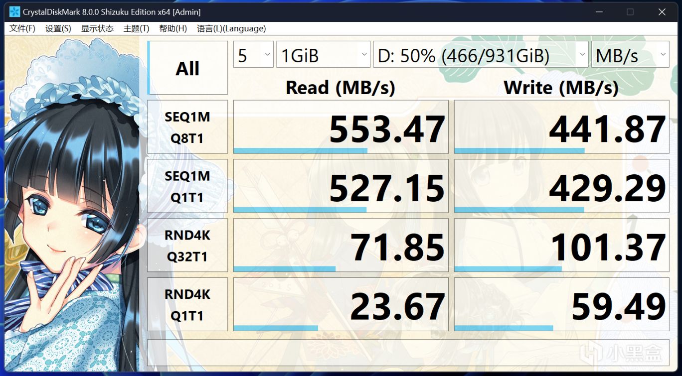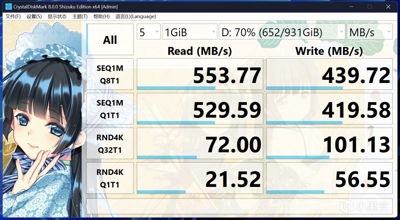 如果U盘的剩余容量越来越少,对U盘的读写性能会有多大的影响呢?这次我就用一个不太严谨的脏盘测试U393的性能。在容量使用50%的情况下,CrystalDiskMark测得的顺序读取速度约为553MB/s,顺序写入速度约为441MB/s。