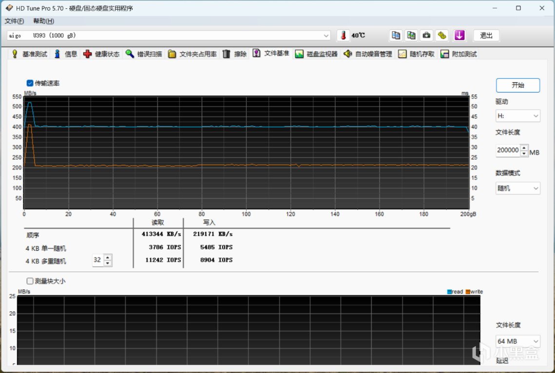 一般情况下随着写入U盘文件体积越来越大,U盘的读写速度会出现掉速的情况。为了验证U393是不是也存在掉速的情况,我使用了HD Tune对它进行了文件基准测试,测试文件长度200GB。除了在一开始出现了波动以外,在整个200GB容量测试中U393的读写曲线非常的平稳。测出的顺序读取速度为413344KB/s,约等于404MB/s;顺序写入速度为219171KB/s,约等于214MB/s。