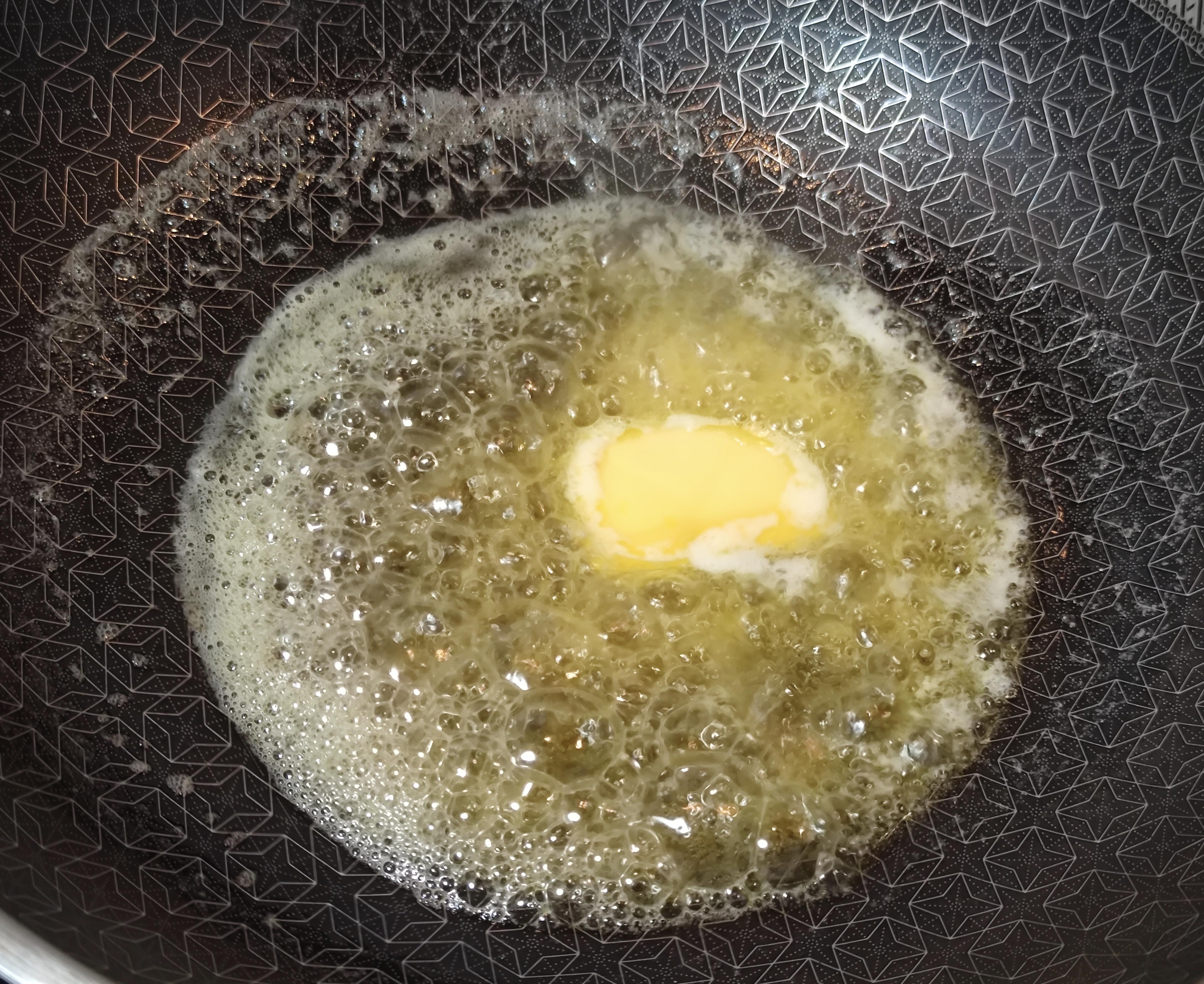 鍋子洗洗乾淨,放入200g黃油融化,下入豬肉沫,中小火炒散炒出豬油。