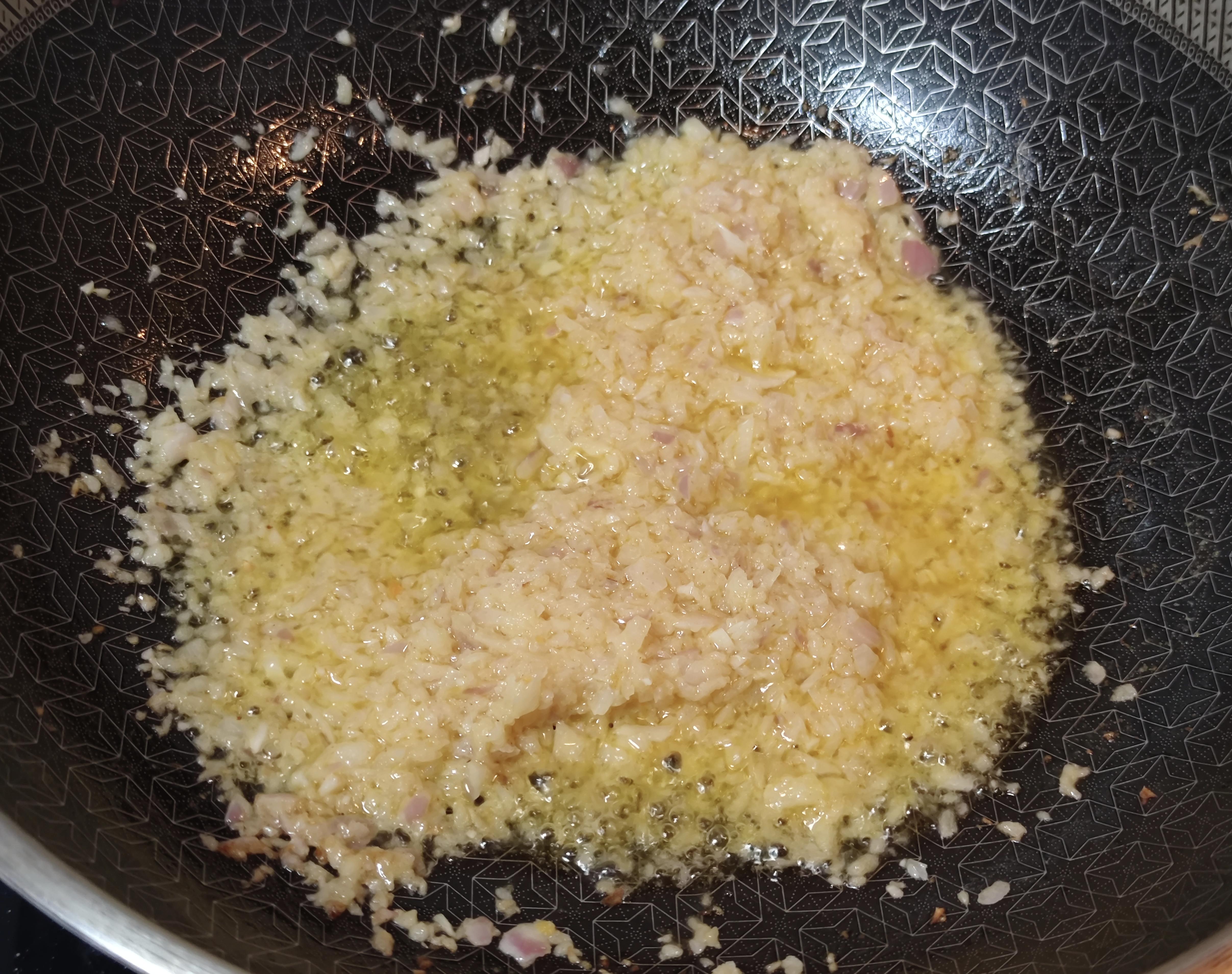 蒜炒香後下入胡蘿蔔碎和芹菜碎,中火炒出水汽,然後加黑胡椒簡單調味後盛出備用。
