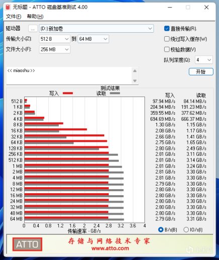 ATTO磁盘基准测试的64MB文件测试中,连续读取速度能达到3.31GB/s,连续写入速度能达到2.79GB/s。