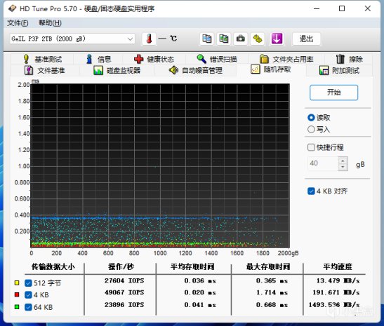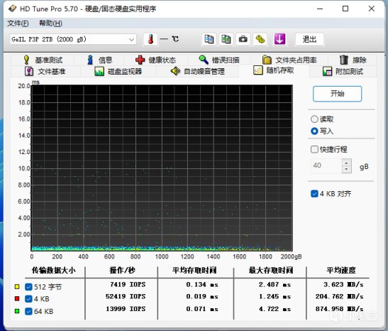HD Tune PRO随机读写测试中,平均读取速度为1493MB/s,平均写入速度为874MB/s。