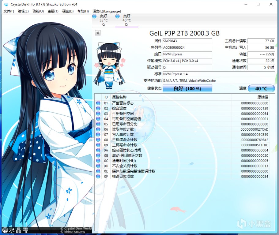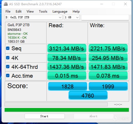 上机实测容量1863GB,crystalDiskinfo软件显示硬盘状态正常,运输在PCIE 3.0 X4模式上,温度比我另一块的致钛TiPro 7000(Gen4)硬盘要低15度。