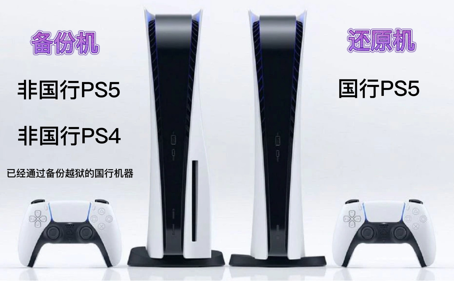 首先我們需要兩臺機器,其中備份機需要的是可以登錄外服的非國行PS5、PS4,或者已經通過備份還原越獄的國行PS4。而還原機則是本次需要登錄外服賬號的國行PS5。