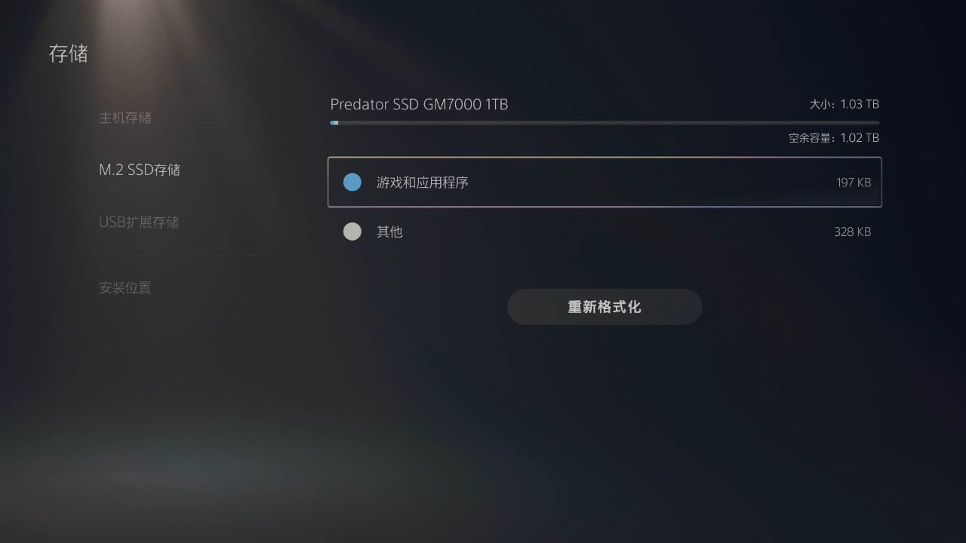▲此時PS5的儲存菜單中已經顯示了新安裝的SSD,我們可以在此選擇PS5與PS4遊戲的默認安裝位置,我個人將對讀寫速度要求更高的PS5遊戲設置到了新安裝的宏碁掠奪者 GM7000上